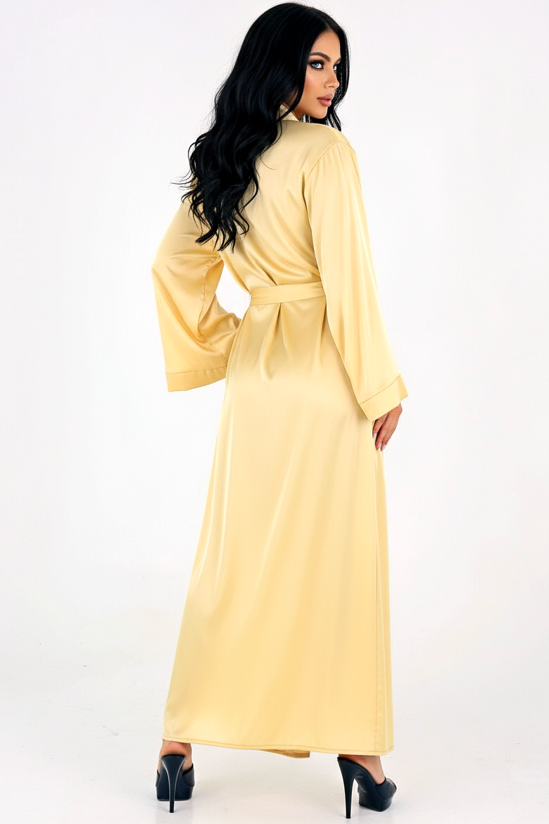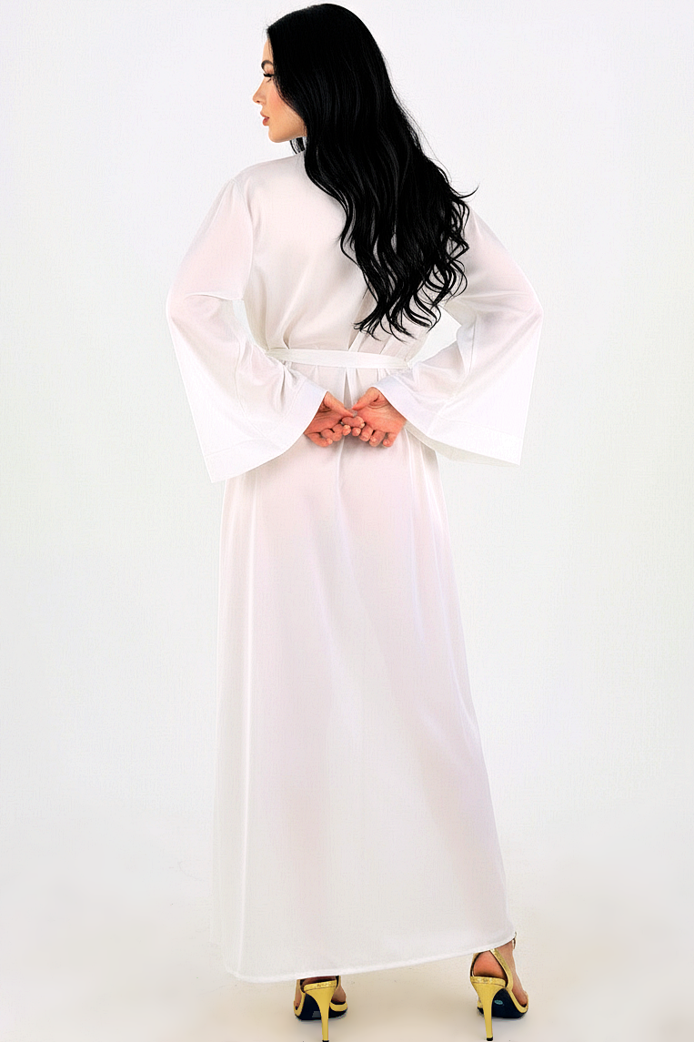 Discover the beauty of simplicity with the Pure Elegance White Kimono. This minimalist piece features clean lines and a luxurious satin finish. The flowing sleeves and tie waist add a touch of sophistication, making it perfect for any occasion.