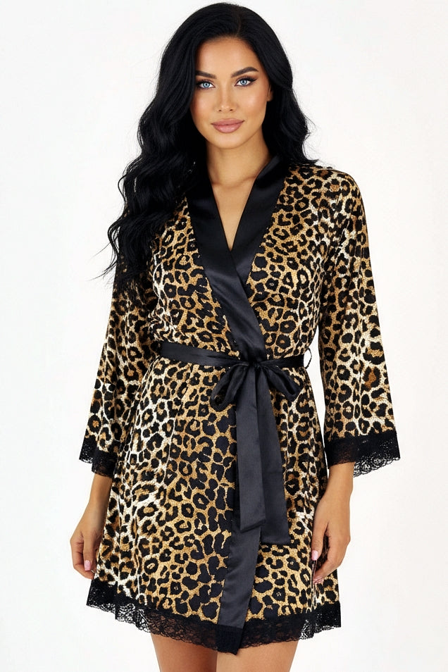 Make a bold statement with the Exotic Leopard Satin Robe. This stunning piece features a daring leopard print combined with elegant black lace. The luxurious satin fabric ensures you stay comfortable while looking effortlessly chic.