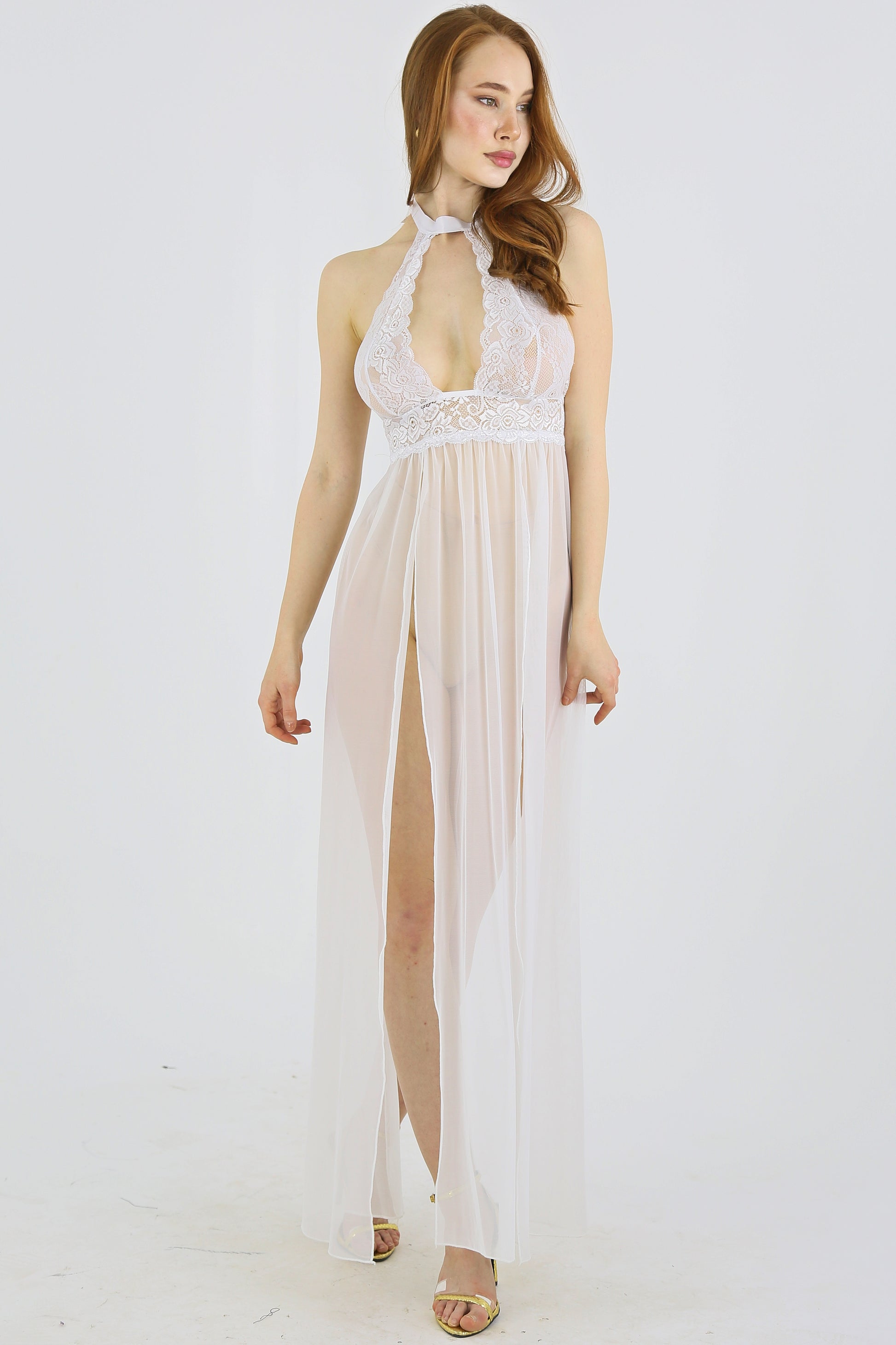 Embrace the epitome of grace with the Angelic Elegance Gown. Featuring a high-neck lace design that flows into a sheer, ethereal skirt, this gown is crafted to exude sophistication and allure. With daring thigh-high slits and intricate detailing, it's the perfect blend of elegance and boldness for unforgettable evenings.