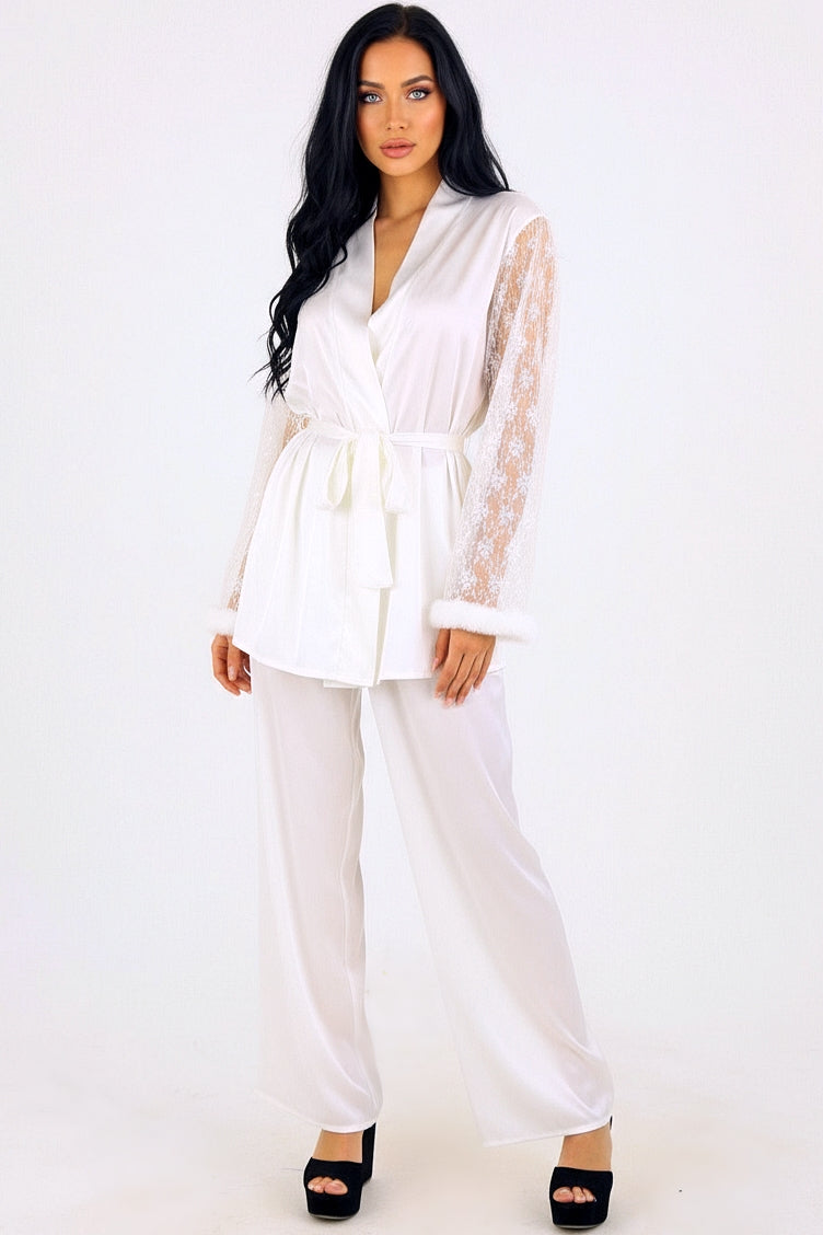 Add a touch of elegance to your nightwear with the Ivory Lace-Trimmed Pajama Set. This beautiful two-piece features a soft satin finish and delicate lace detailing. Perfect for a relaxing evening at home.