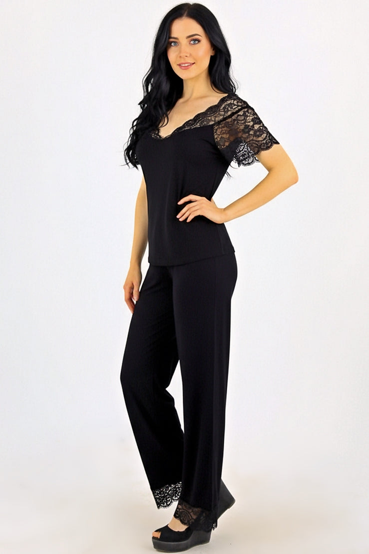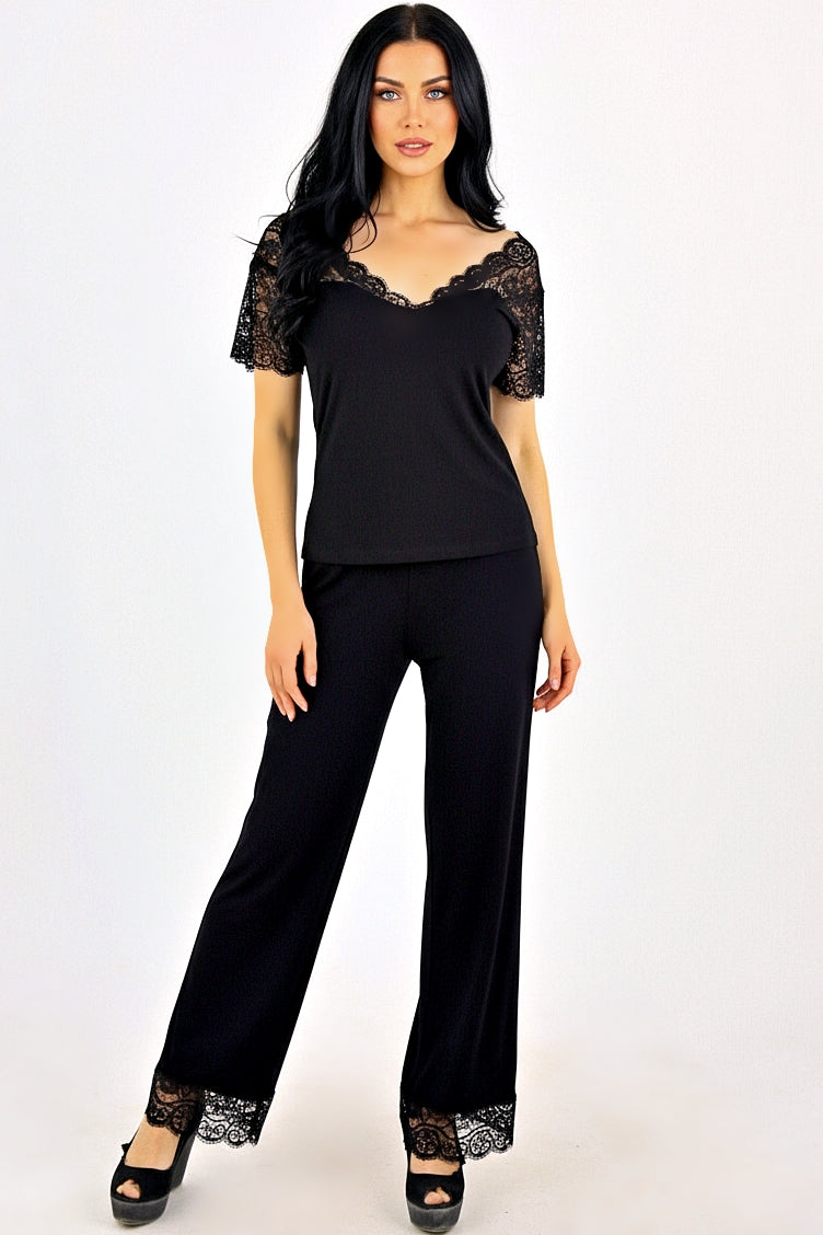 Step into timeless elegance with the Elegance in Black Jumpsuit. This sophisticated piece features intricate lace sleeves and a flattering fit that hugs your curves in all the right places. Ideal for an evening out or a chic night in.