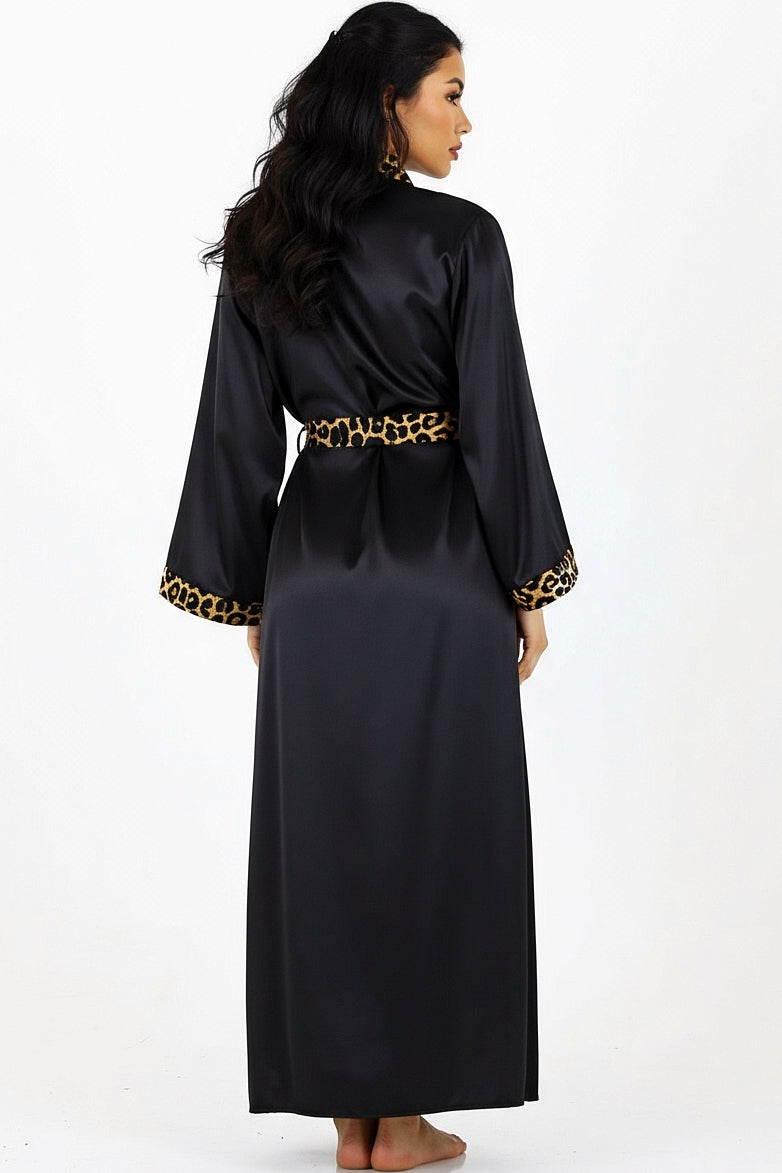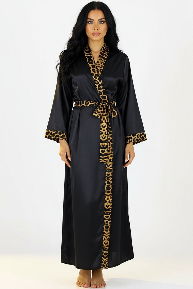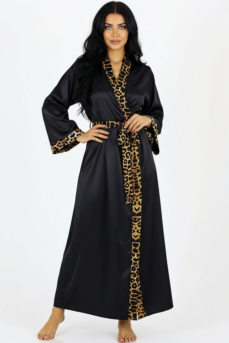 Unleash your wild side with the Leopard Print Glamour Robe. This fierce and fabulous piece combines bold leopard print with luxurious satin. The elegant black lace accents add a touch of sophistication, making it a must-have for any fashionista.
