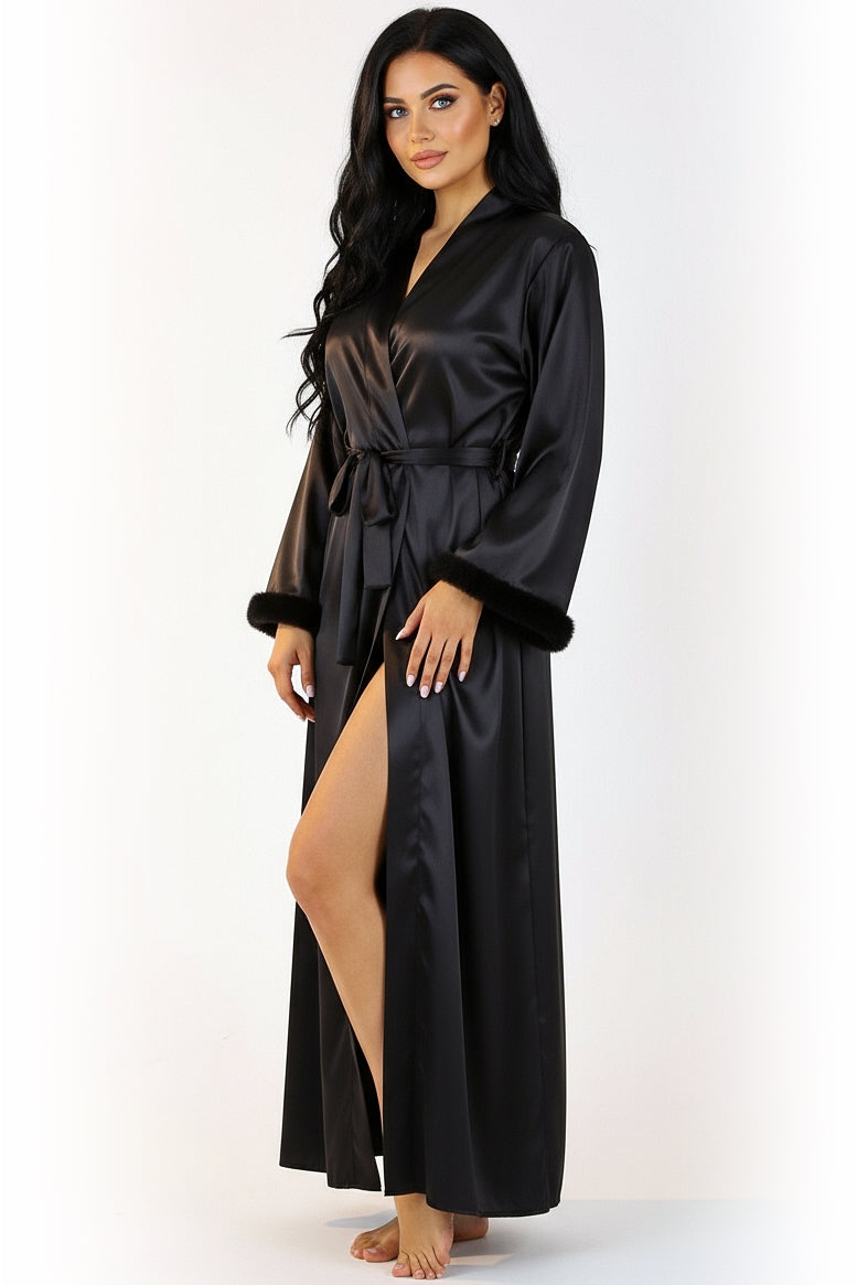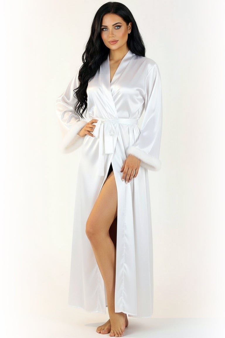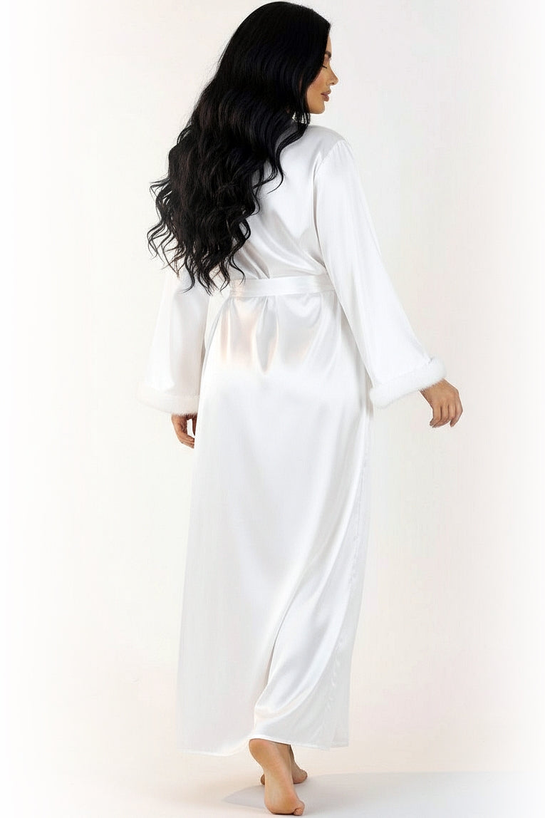 Indulge in the ultimate luxury with the Ivory Satin Elegance Robe. This stunning robe is crafted from the finest satin and features elegant feather trims. Perfect for making any evening feel special.