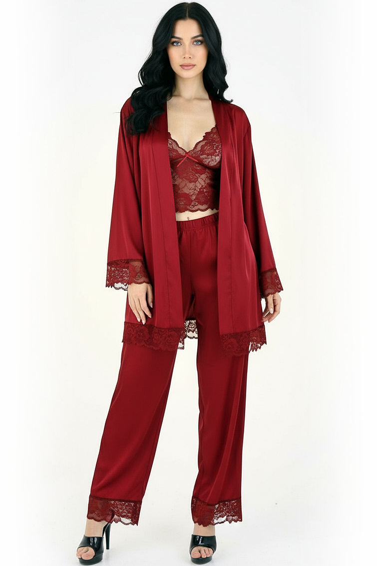 Wrap yourself in luxury with the Blush Elegance Robe Set. This beautiful two-piece features a blush pink satin robe with black lace accents and matching pants. The set is perfect for lounging in style or adding a touch of glamour to your evenings.