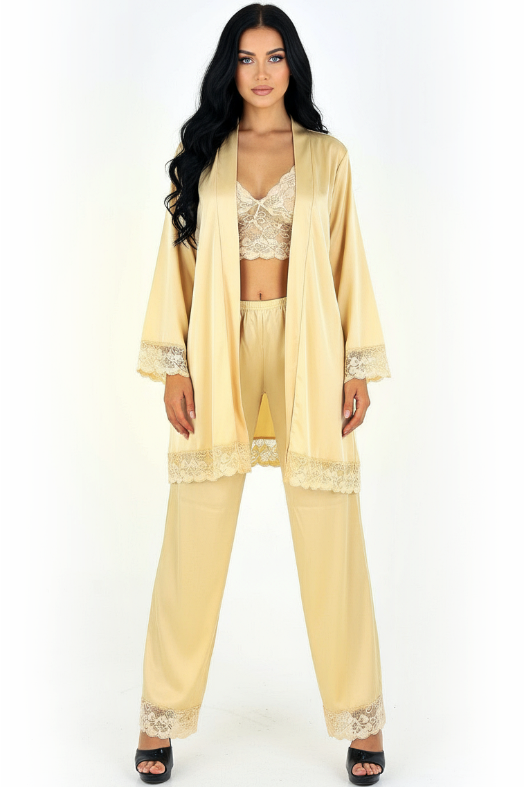Wrap yourself in luxury with the Blush Elegance Robe Set. This beautiful two-piece features a blush pink satin robe with black lace accents and matching pants. The set is perfect for lounging in style or adding a touch of glamour to your evenings.
