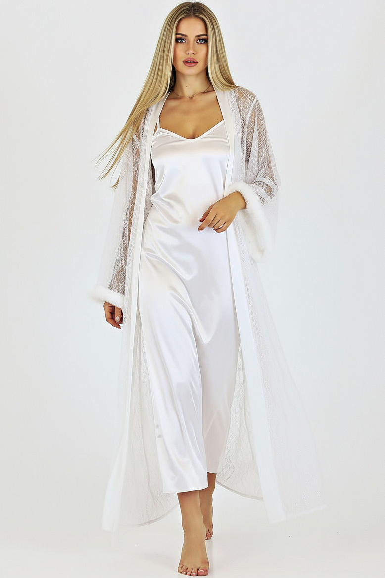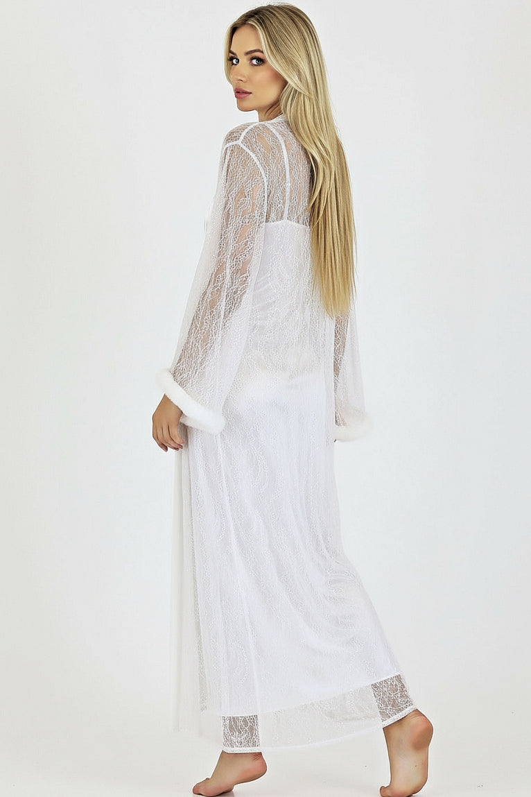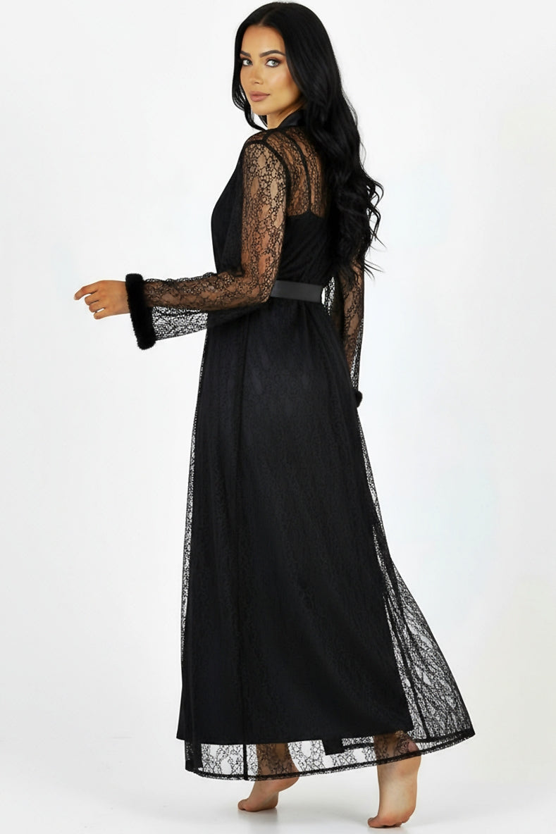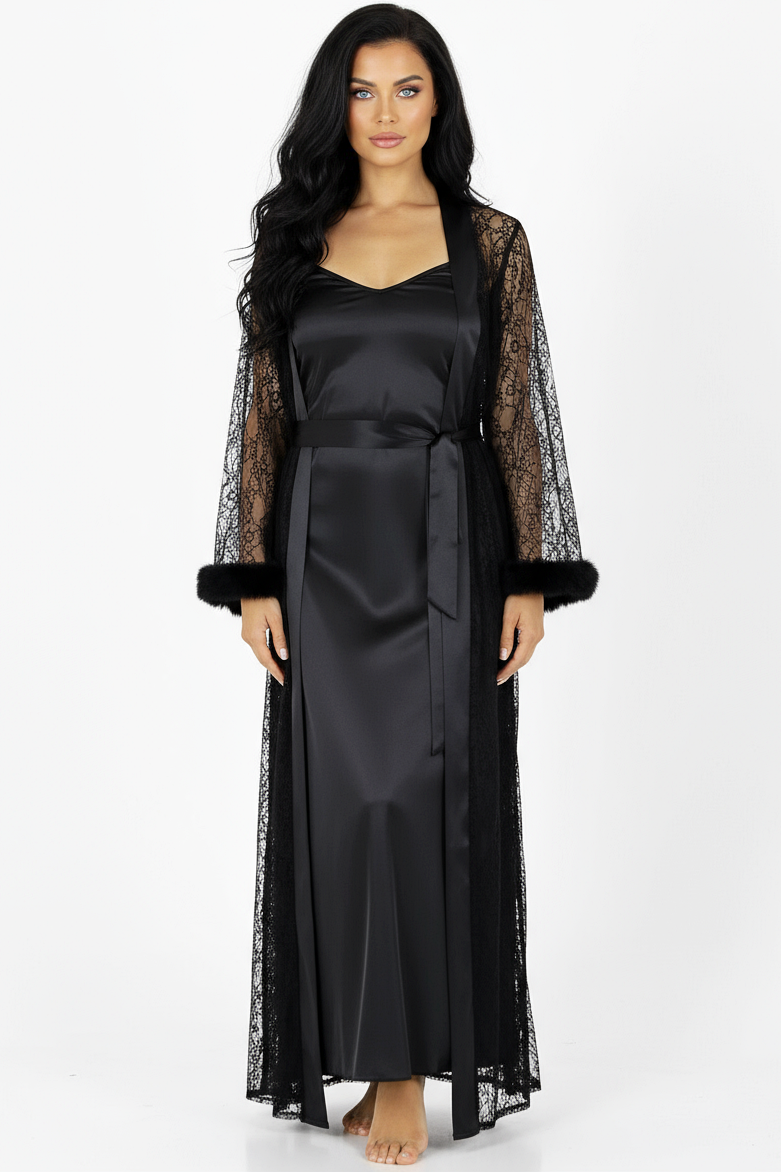 Embrace luxury with the Lace & Fur Elegance Robe. This exquisite piece features delicate black lace and soft fur trim. Perfect for adding a touch of opulence to your nightwear collection.