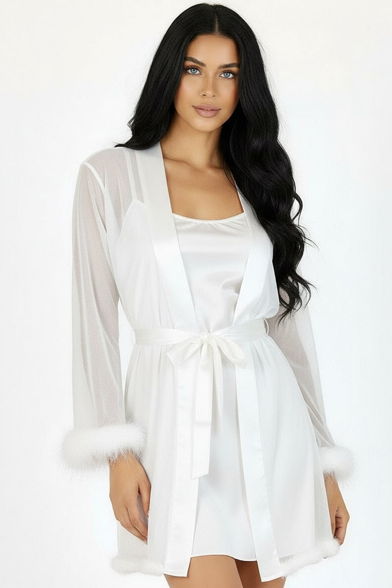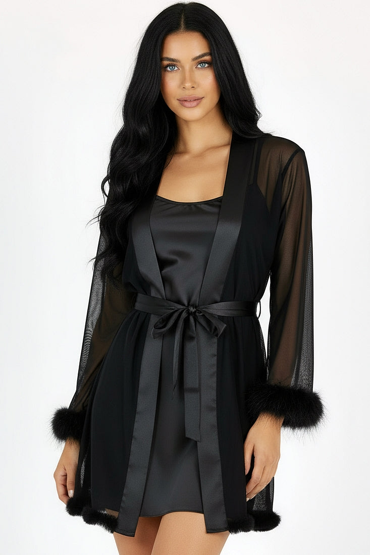 Embrace your inner diva with the Noir Feathered Fantasy Set. This exquisite nightwear features a sleek satin slip adorned with delicate feather trims. The matching robe adds a dramatic flair, making you feel like a star in your own home.